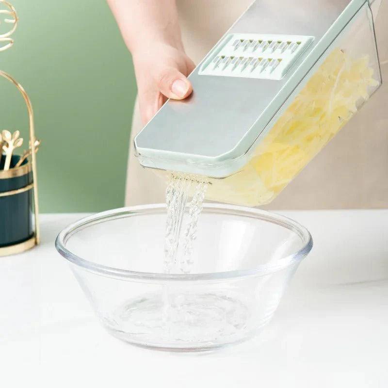 Pronto para Cortar e Lavar: Com abertura nos uniformes, o fatiador ajustável de cozinha para batatas e cebolas permite fácil lavagem e remoção de vegetais, simplificando o processo de preparação antes do corte.